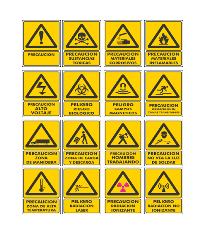 Ejemplo. Precaución piso resbaloso, precaución sustancia toxica, precaución sustancia corrosiva, precaución riesgo bilógico etérea.
